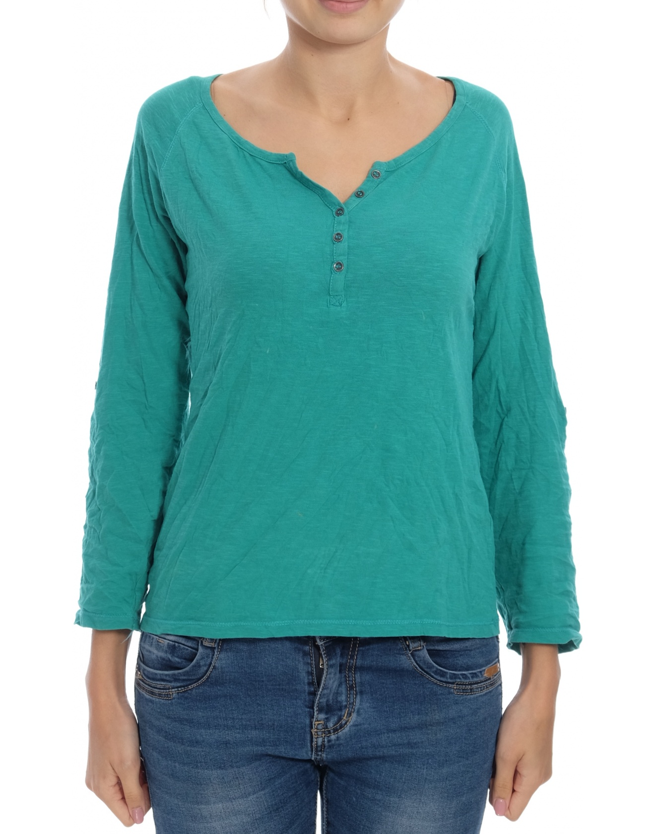 Мека блуза в зелено, с копчета за скъсяване на ръкавите.